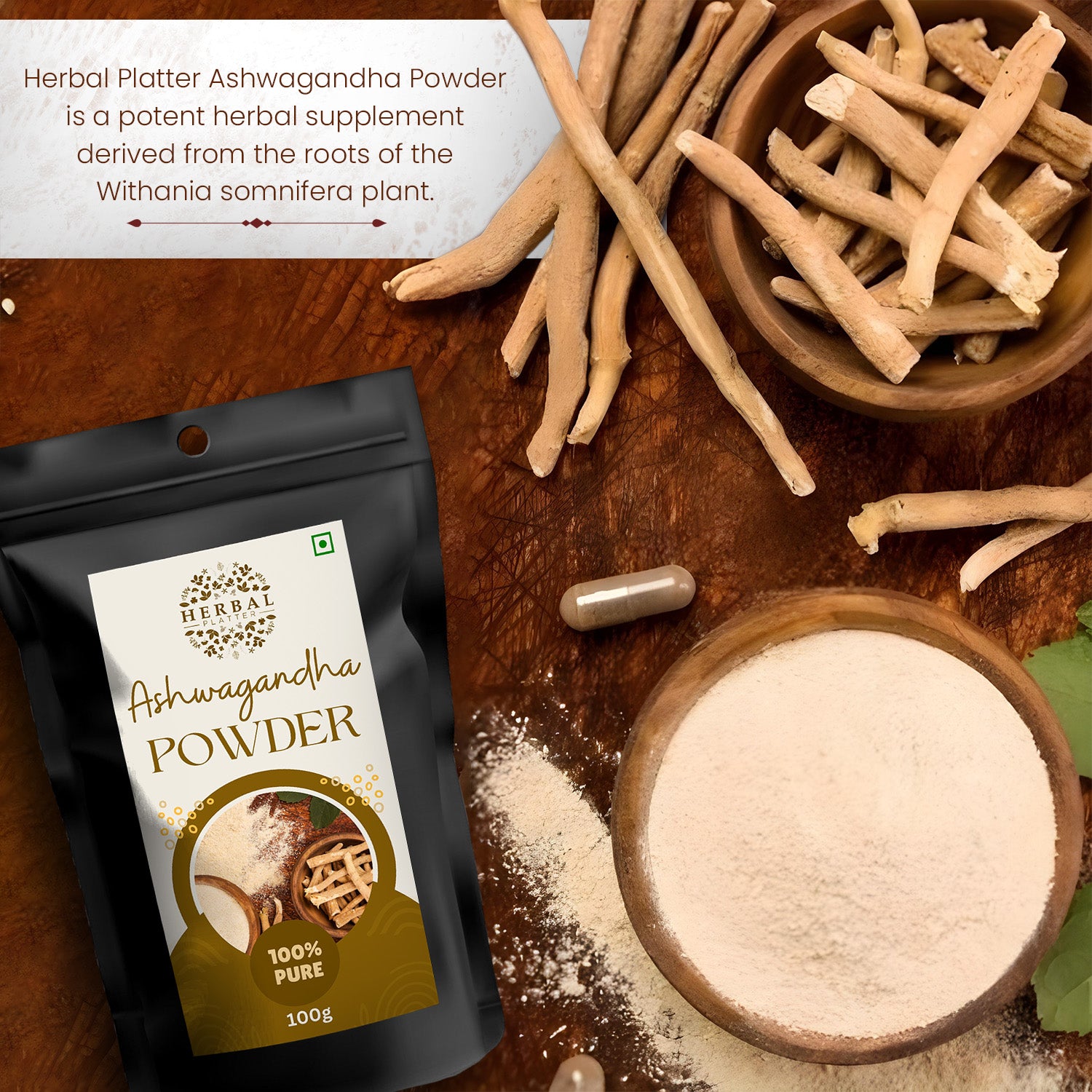 Herbal Platter Ashwagandha Powder. Harnessing the ancient wisdom of Ayurveda, our premium powder is derived from the finest ashwagandha roots, renowned for their adaptogenic properties. Experience a natural way to manage stress, boost energy, and promote overall vitality. Incorporate into your daily routine by mixing with water, smoothies, or warm beverages. Elevate your wellness journey with Herbal Platter Ashwagandha Powder – your key to balance and well-being.