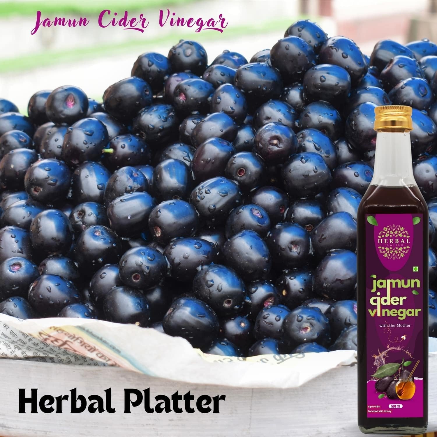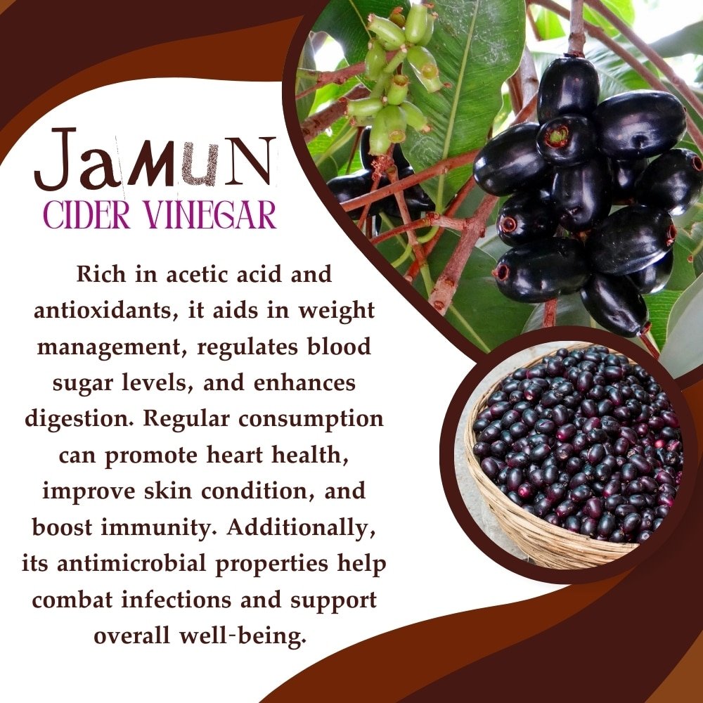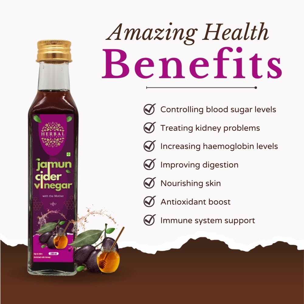 Herbal Platter's Jamun Cider Vinegar, meticulously crafted from the finest Jamun fruit. Packed with antioxidants and essential nutrients, this vinegar offers a myriad of benefits for your health and well-being. From regulating blood sugar levels to promoting digestion and enhancing skin health, each drop is a testament to nature's bounty. Versatile and delicious, incorporate it into your culinary creations or enjoy it diluted in water as a refreshing tonic. Embrace holistic wellness with Herbal Platter's Jamun Cider Vinegar. Herbal Platter's Jamun Cider Vinegar, a powerhouse of natural goodness crafted to elevate your health and well-being. Derived from the finest Jamun fruit, renowned for its rich nutritional profile and therapeutic properties, this vinegar is a testament to nature's bounty. Jamun, also known as Indian blackberry or Java plum, is revered for its antioxidant-rich composition, which aids in detoxifying the body and bolstering immunity. Our artisanal process carefully extracts the essence of Jamun, ensuring that every drop is packed with essential vitamins, minerals, and enzymes. With Herbal Platter's Jamun Cider Vinegar, you unlock a myriad of benefits for your body and mind. Regular consumption may help regulate blood sugar levels, making it an invaluable addition to your dietary regimen, especially for those managing diabetes. Its alkalizing properties promote digestion, aiding in weight management and relieving gastrointestinal discomfort. Moreover, the natural acidity of Jamun Cider Vinegar offers a plethora of skincare benefits, from balancing pH levels to combating acne and blemishes, leaving your skin radiant and rejuvenated. Its antimicrobial properties also contribute to oral health, fighting off harmful bacteria and promoting gum health. Embrace the holistic goodness of Herbal Platter's Jamun Cider Vinegar as a versatile addition to your culinary repertoire. Whether used in salad dressings, marinades, or simply diluted in water as a refreshing tonic, this elixir promises to invigorate your senses and nourish your body from within. Experience the harmony of nature with every sip of Herbal Platter's Jamun Cider Vinegar and embark on a journey towards holistic well-being.