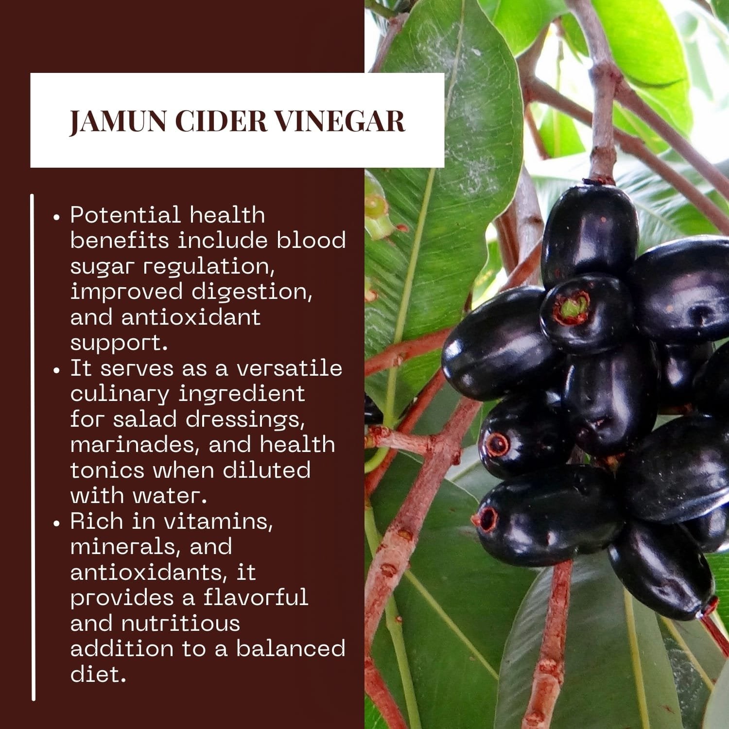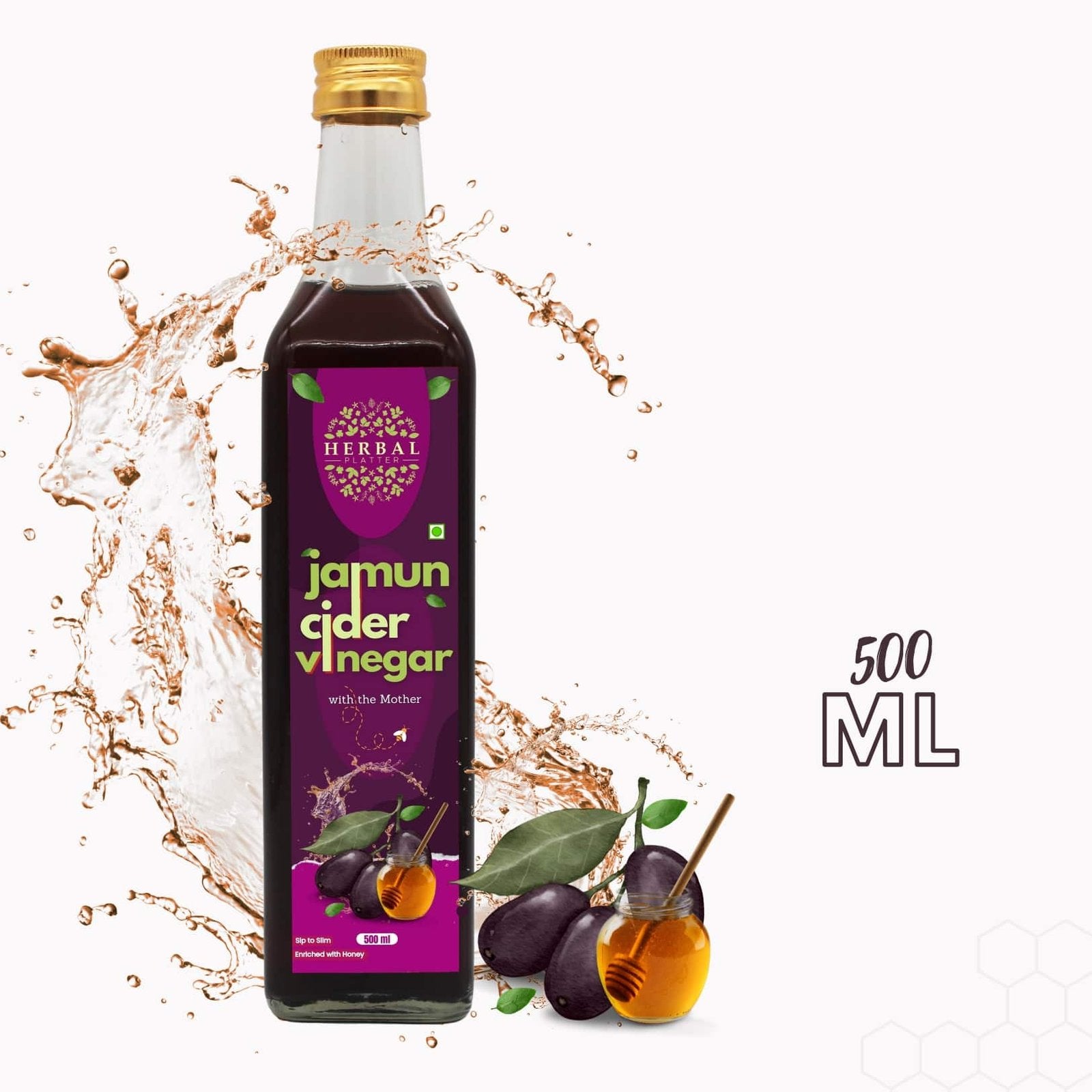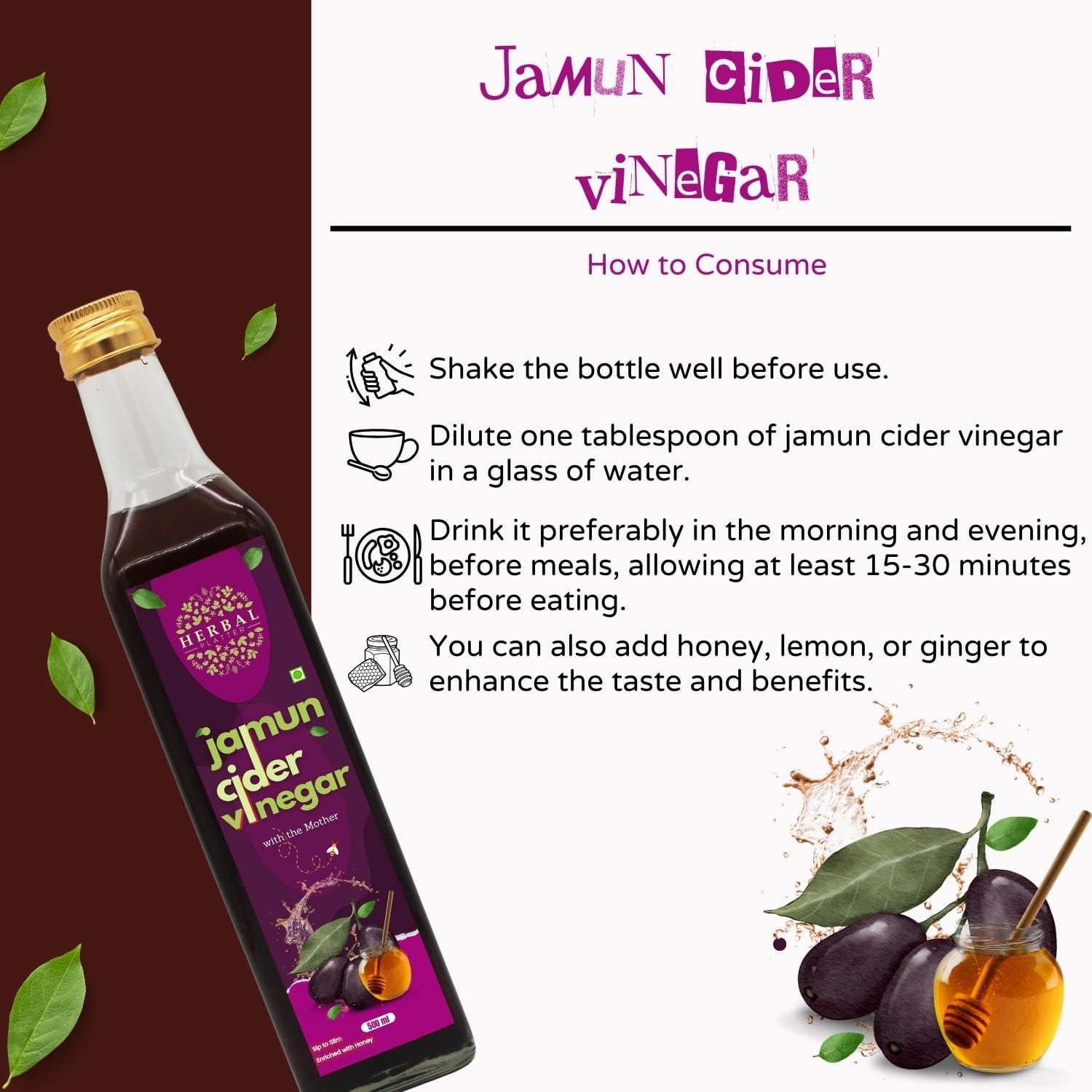 Herbal Platter's Jamun Cider Vinegar, meticulously crafted from the finest Jamun fruit. Packed with antioxidants and essential nutrients, this vinegar offers a myriad of benefits for your health and well-being. From regulating blood sugar levels to promoting digestion and enhancing skin health, each drop is a testament to nature's bounty. Versatile and delicious, incorporate it into your culinary creations or enjoy it diluted in water as a refreshing tonic. Embrace holistic wellness with Herbal Platter's Jamun Cider Vinegar. Herbal Platter's Jamun Cider Vinegar, a powerhouse of natural goodness crafted to elevate your health and well-being. Derived from the finest Jamun fruit, renowned for its rich nutritional profile and therapeutic properties, this vinegar is a testament to nature's bounty. Jamun, also known as Indian blackberry or Java plum, is revered for its antioxidant-rich composition, which aids in detoxifying the body and bolstering immunity. Our artisanal process carefully extracts the essence of Jamun, ensuring that every drop is packed with essential vitamins, minerals, and enzymes. With Herbal Platter's Jamun Cider Vinegar, you unlock a myriad of benefits for your body and mind. Regular consumption may help regulate blood sugar levels, making it an invaluable addition to your dietary regimen, especially for those managing diabetes. Its alkalizing properties promote digestion, aiding in weight management and relieving gastrointestinal discomfort. Moreover, the natural acidity of Jamun Cider Vinegar offers a plethora of skincare benefits, from balancing pH levels to combating acne and blemishes, leaving your skin radiant and rejuvenated. Its antimicrobial properties also contribute to oral health, fighting off harmful bacteria and promoting gum health. Embrace the holistic goodness of Herbal Platter's Jamun Cider Vinegar as a versatile addition to your culinary repertoire. Whether used in salad dressings, marinades, or simply diluted in water as a refreshing tonic, this elixir promises to invigorate your senses and nourish your body from within. Experience the harmony of nature with every sip of Herbal Platter's Jamun Cider Vinegar and embark on a journey towards holistic well-being.