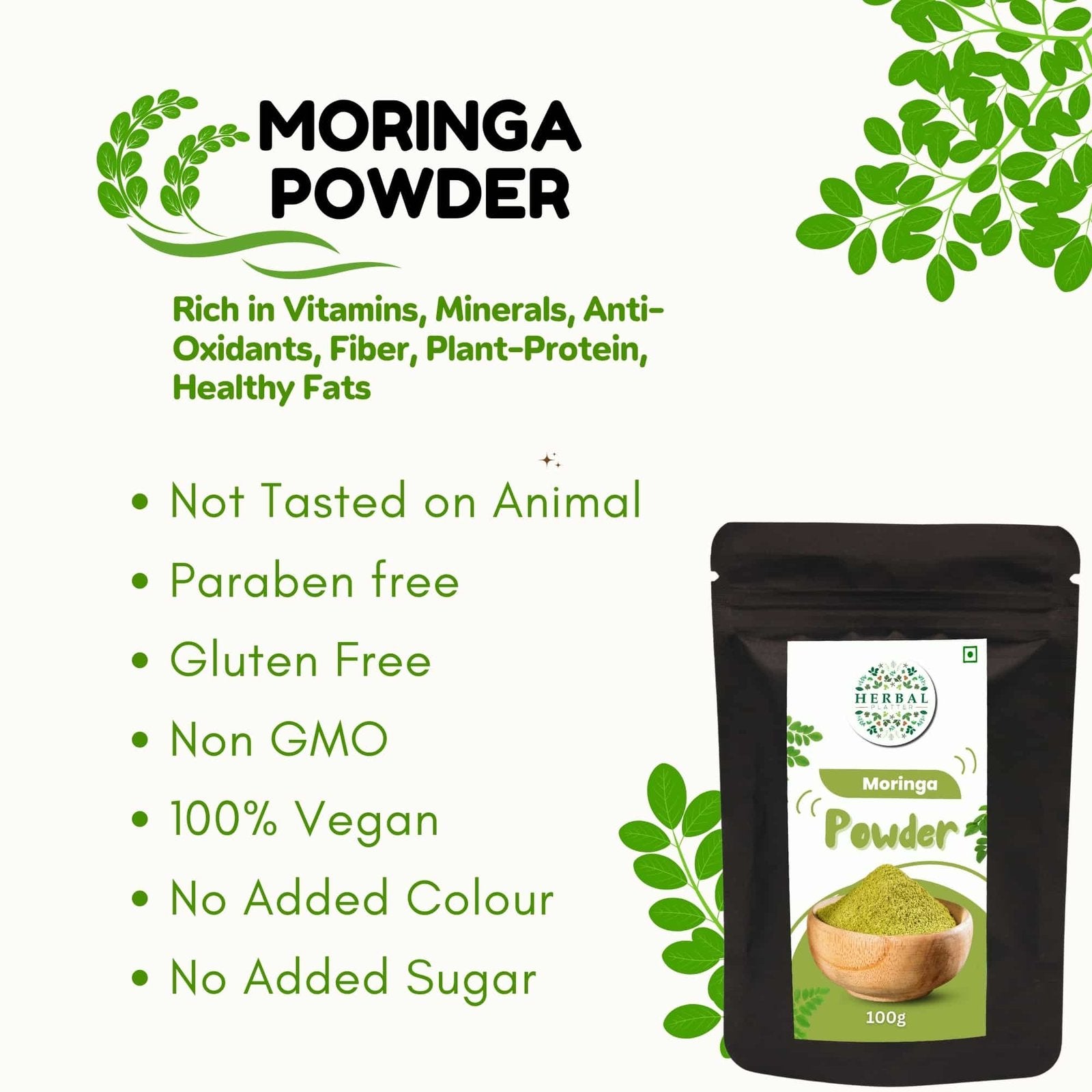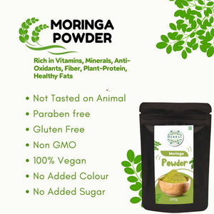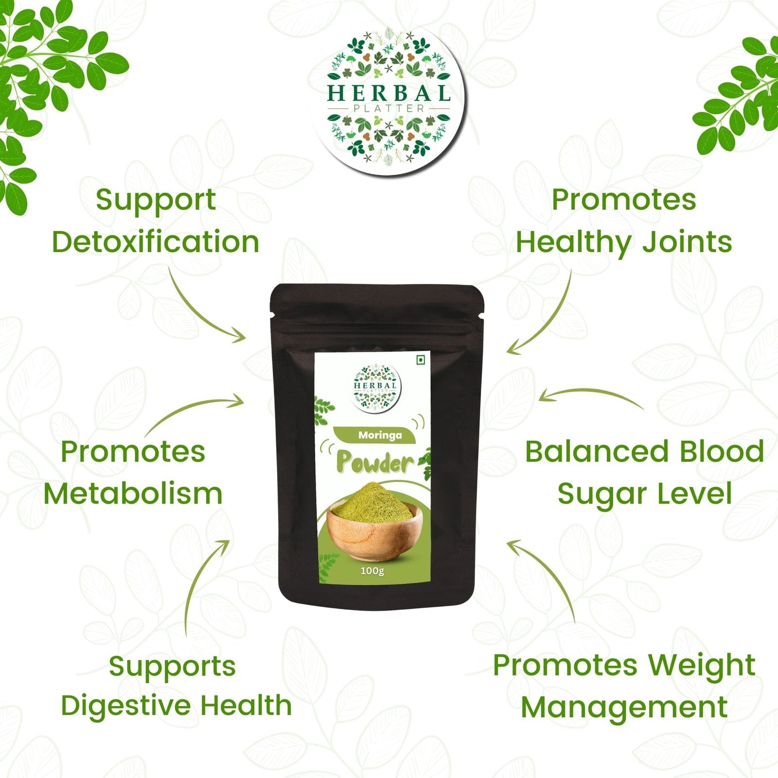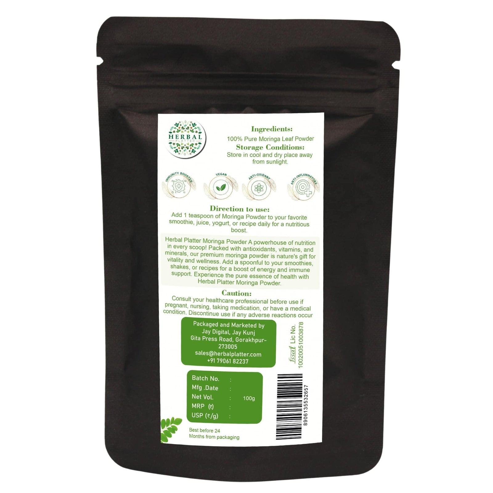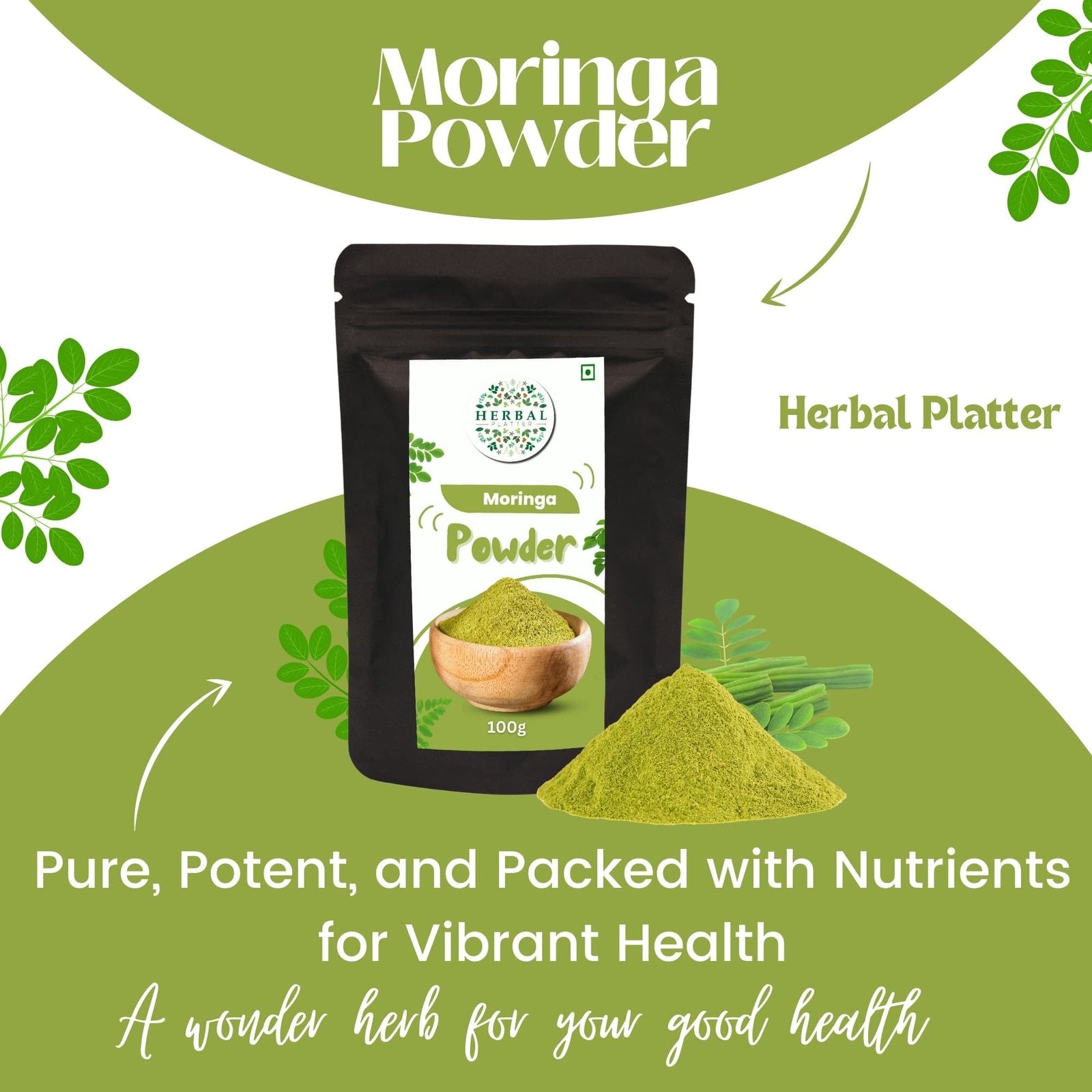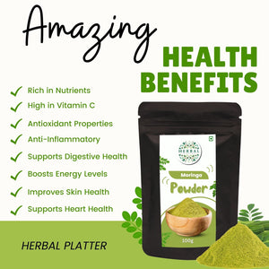 Herbal Platter Moringa Leaves Powder. Crafted from the revered Moringa Oleifera tree, this Ayurvedic gem is a symphony of 90 essential nutrients and 46 potent antioxidants. Nourish your body with a rich blend of vitamins A, B1, B2, B3, B6, K, E, and C, delivering unparalleled nourishment. Elevate your wellness journey with immunity-boosting, skin-revitalizing, and hair-stimulating properties. Experience the difference with Moringa Marvel by Herbal Platter, and unlock the full potential of your health and vitality.
